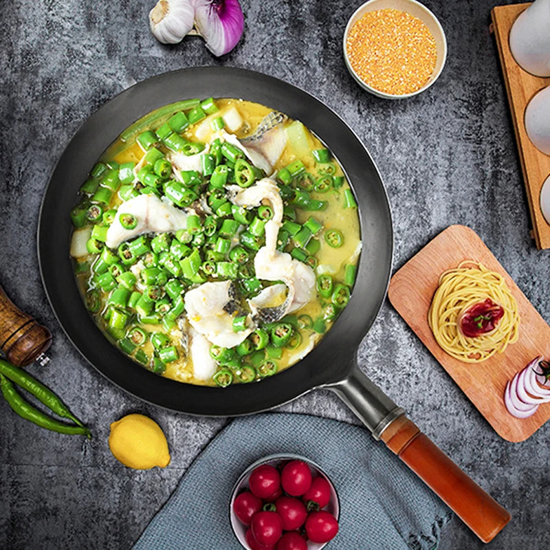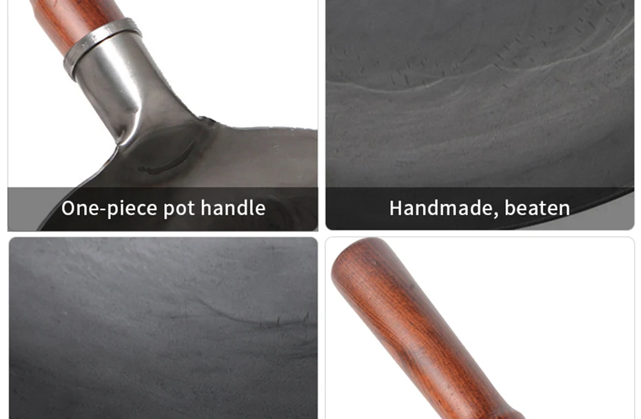 Hand Hammered Wok,Chinese Traditional Iron Wok No Coating Wooden Handle Non-Stick Pan Kitchen Cookware