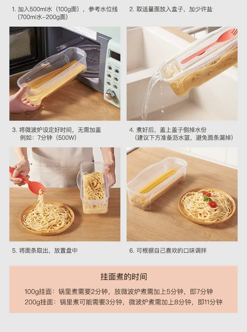 Well-Designed: With a lid and draining holes, and a fork-spoon, in addition to cooking pastas, it can also be used as a storage box.