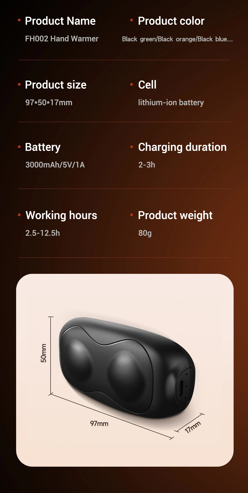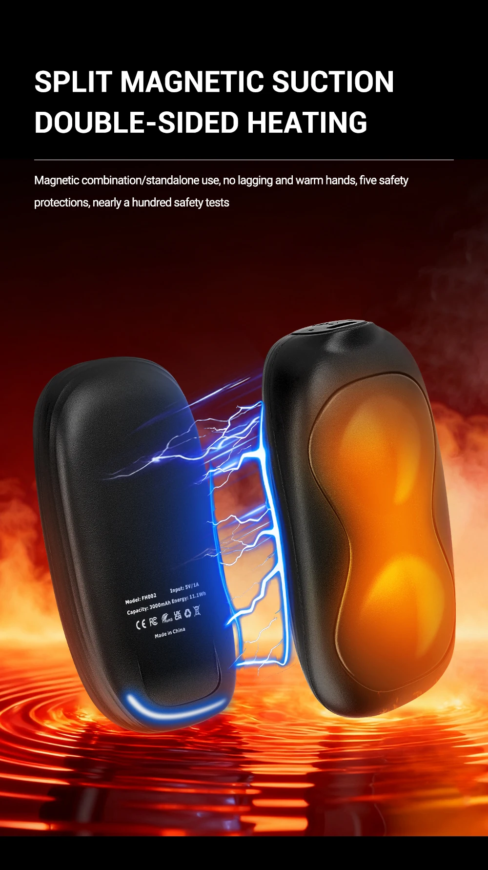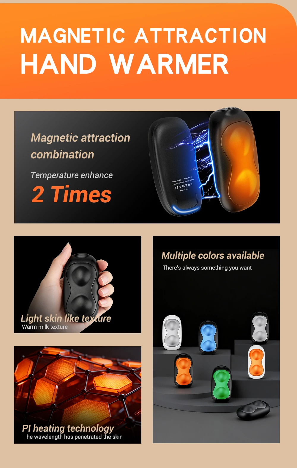 1.Innovative Magnetic Design: This smart hand warmer features a unique magnetic design, allowing two detachable units to easily attach or be used independently. Its compact size and lightweight make it ideal for outdoor activities like camping and skiing.
