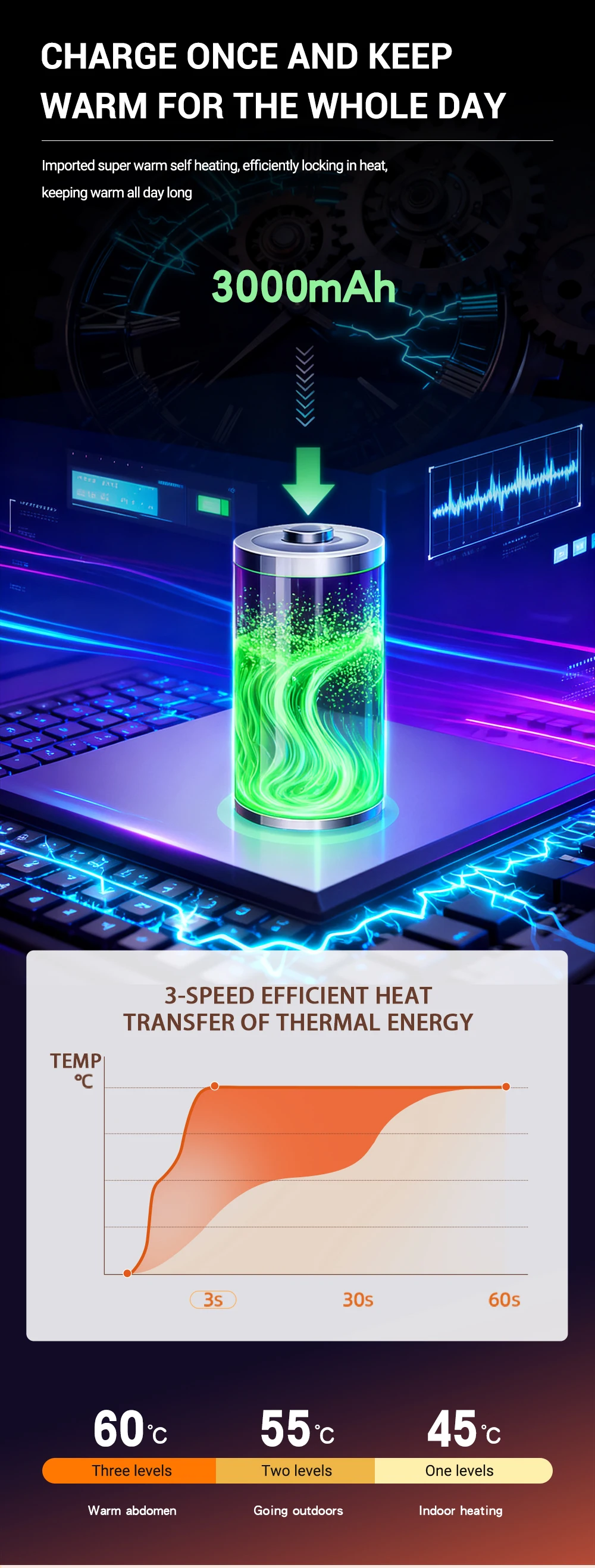 2.Longer Lasting Warmth: With an enhanced 3000mAh x2 rechargeable battery capacity and performance, enjoy 4-8 hours of continuous heat, ideal for all-day outdoor activities.