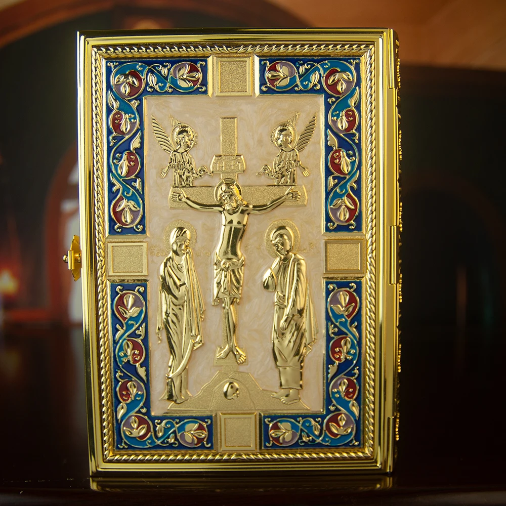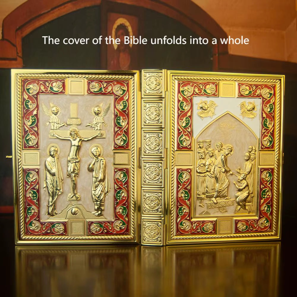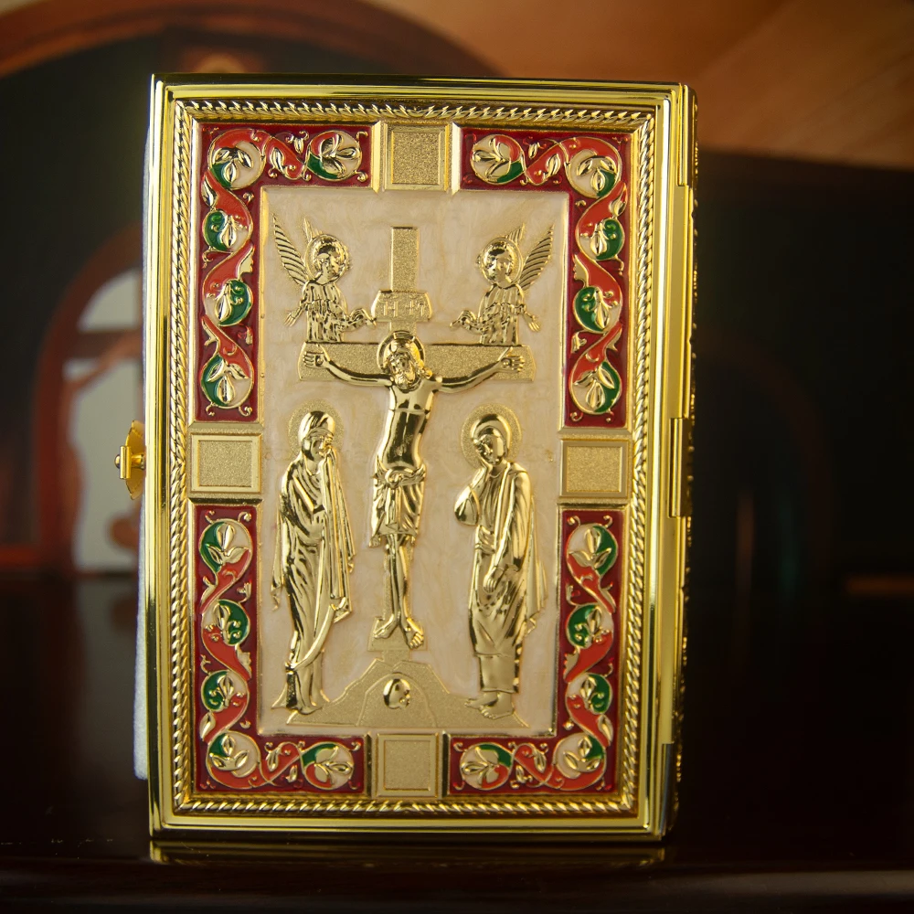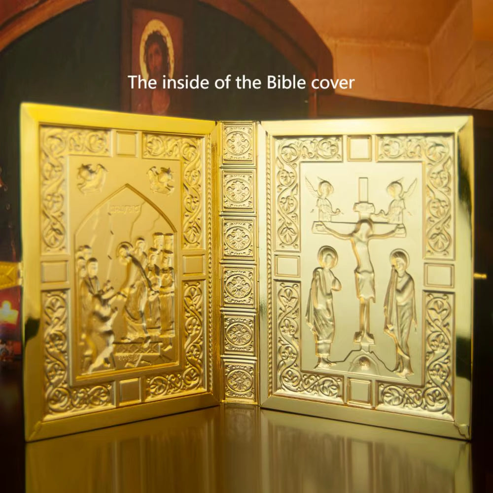 Orthodox Bible Cover with Engraved Passion of Christ Icon 8.3In/7.5In Zinc Alloy Gold Plated Orthodox Religious Art for Church