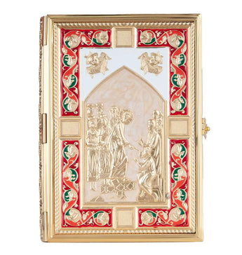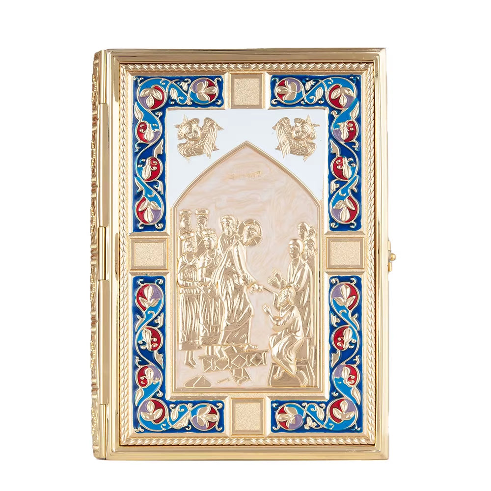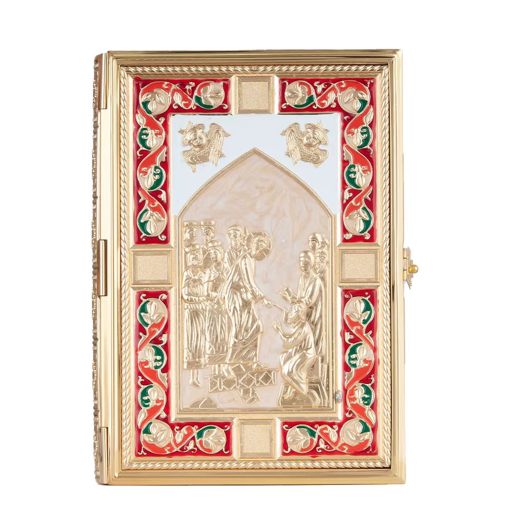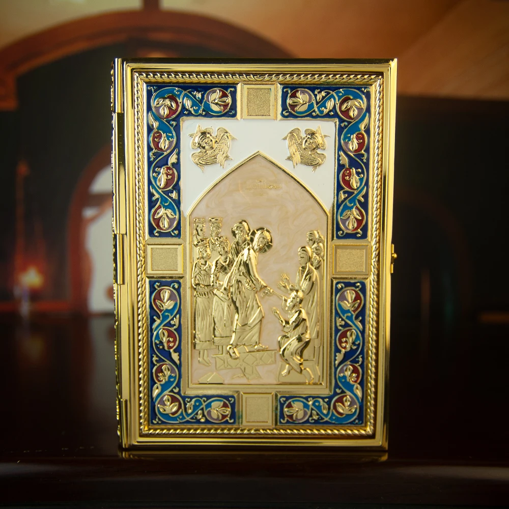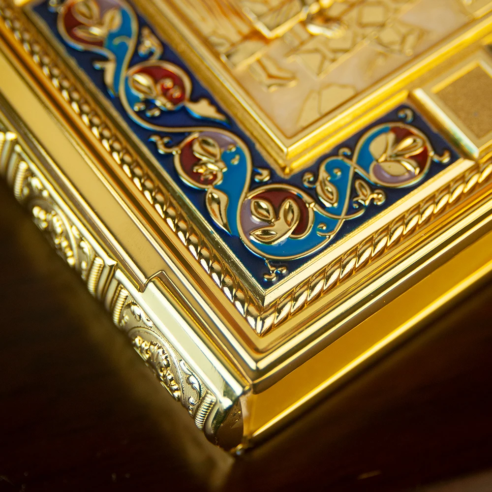Orthodox Bible Cover with Engraved Passion of Christ Icon 8.3In/7.5In Zinc Alloy Gold Plated Orthodox Religious Art for Church