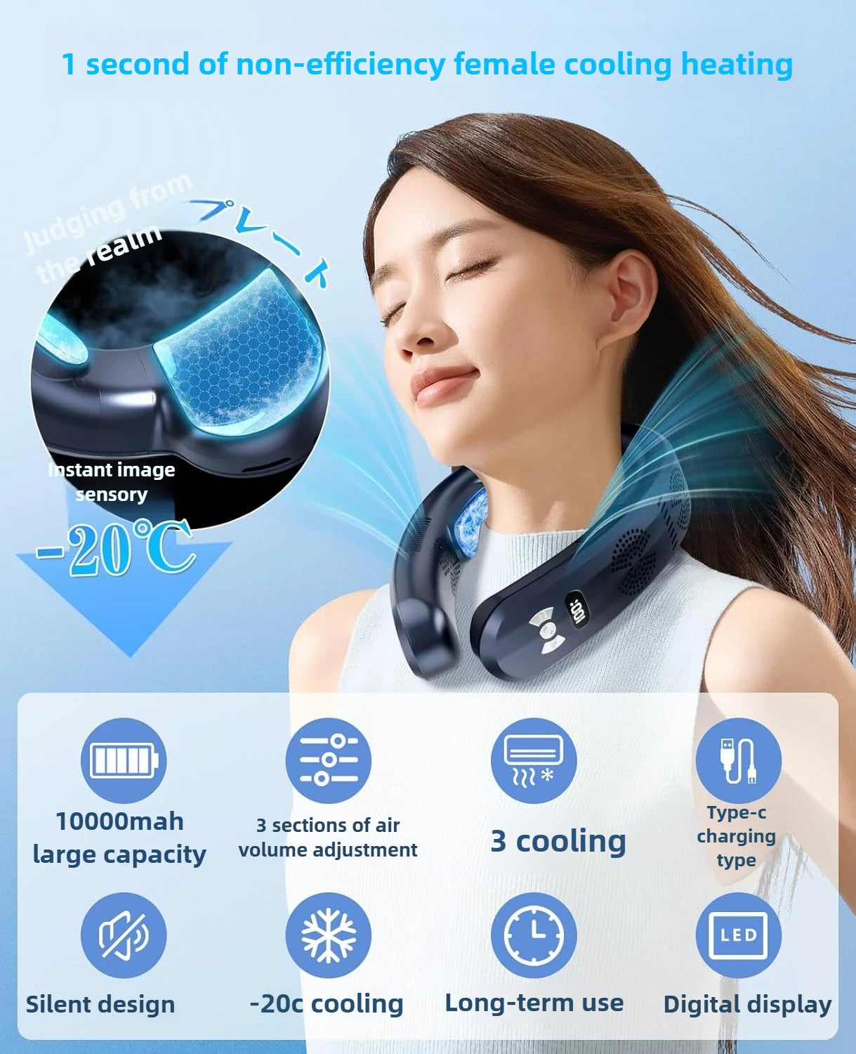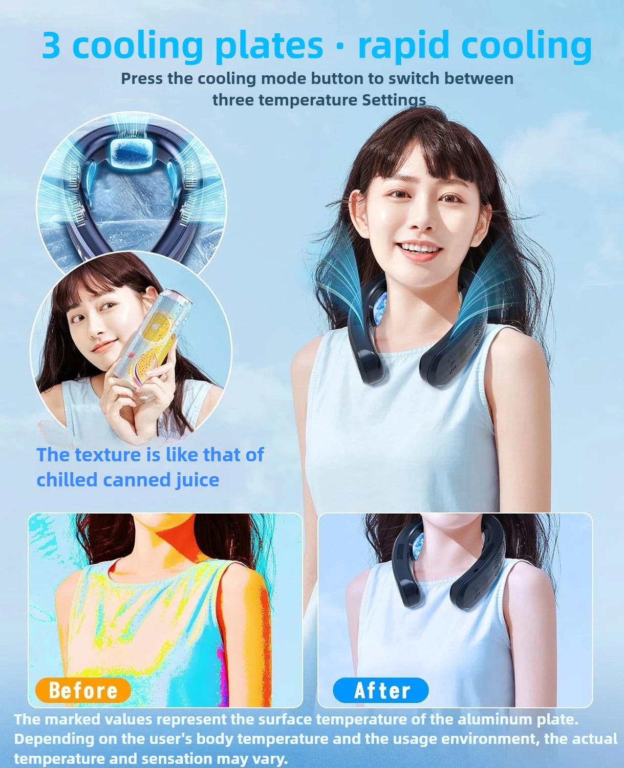 🧊[Introducing the industry's first "ice and fire" neck cooler!] Our neck fan has a 3-way function with 3-stage airflow mode, 3-stage cooling mode and 3-stage heating mode, so you can use it all year round regardless of the season. The upgraded cooling plate at the back of the neck achieves a 150% expansion of the cooling area, far exceeding the industry standard. The aluminum plate with high thermal conductivity and reflectivity starts heating and cooling instantly, and you can feel cool and warm in about 1 second. The temperature is rapidly cooled to MAX-19°C, and the cool feeling of a cold can is transmitted from the neck to the skin, so you can stay comfortable even in the heat of summer!