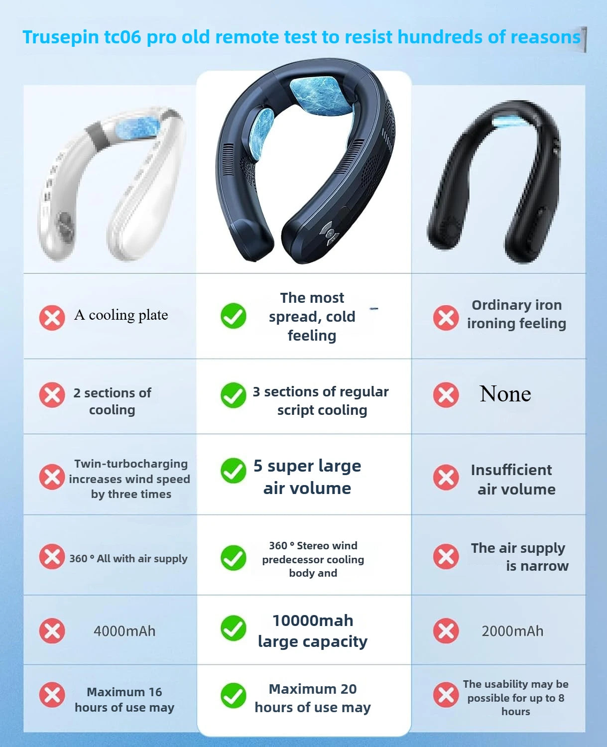 In order to reduce noise, this halterneck fan reduces the intensity of the fan outlet, the air outlet of this product is relatively soft, the wind force is moderate, and it will not cause any harm to the human body, if the product wind is too strong and wears for a long time, it will cause dry skin, respiratory irritation, headache or joint pain So its air volume will not be very strong, mainly relying on and cooperating with the semiconductor refrigeration sheet to produce the cold feeling from the cold feeling (if you can't accept the soft wind, please do not buy and return, If you just want to buy a halterneck fan with strong wind and does not rely on semiconductor cooling, you can check other products in my store), and this product has a heating function, which can be used as a scarf in winter, thank you