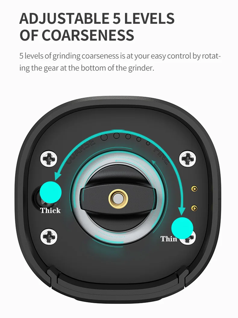 5-Level Adjustable Coarseness. Choose the coarseness of grains according to your preference. Rotate the knob on the bottom clockwise for a finer grind or anticlockwise for a coarse grind. Utilize the durable and safe 304 stainless steel drive shaft to bring spices into wanted granular sizes. Spread freshly ground spices for added flavor and taste.