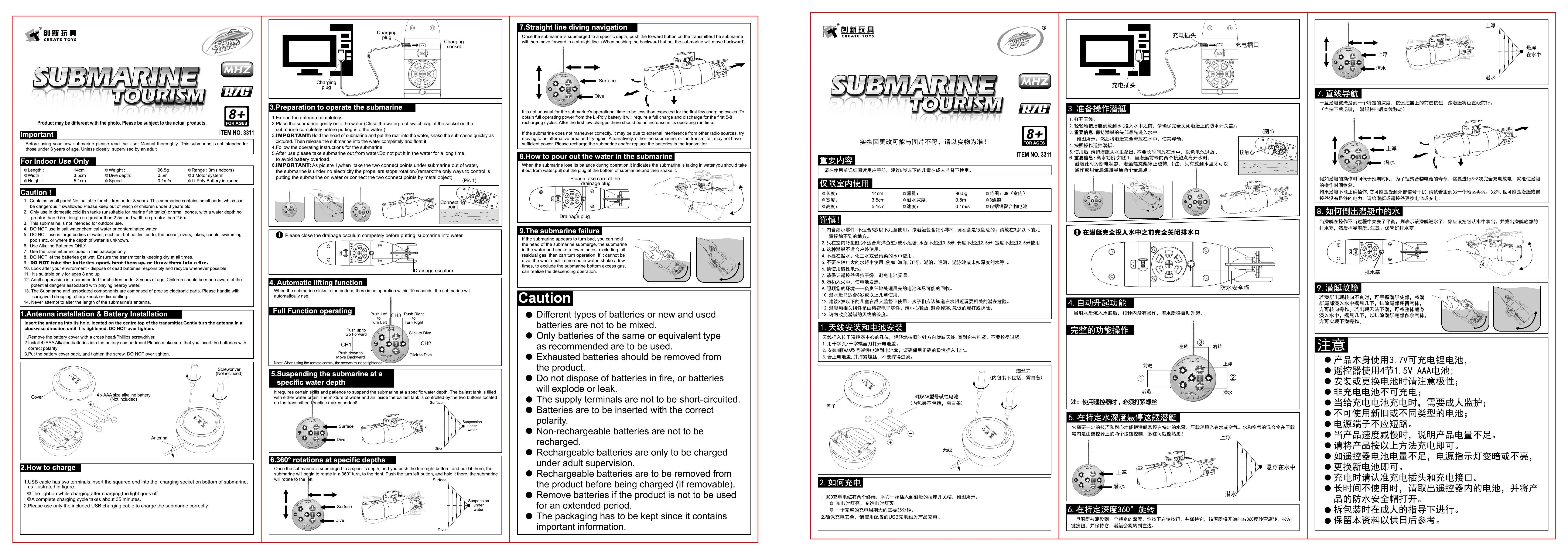This RC submarine can go up and down, forward and backward, turn left and right and do 360° turning around like a real one. It's waterproof and can dive in water. It's an ideal gift for kids.