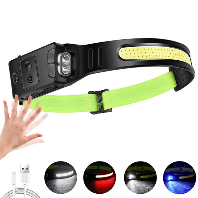 COB headlamp features a design with COB LED technology for a much wider surface can be covered by the light beam with less glare.