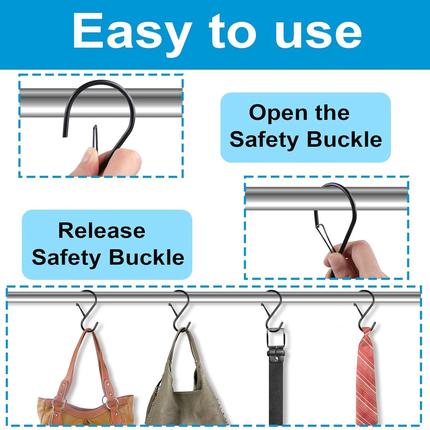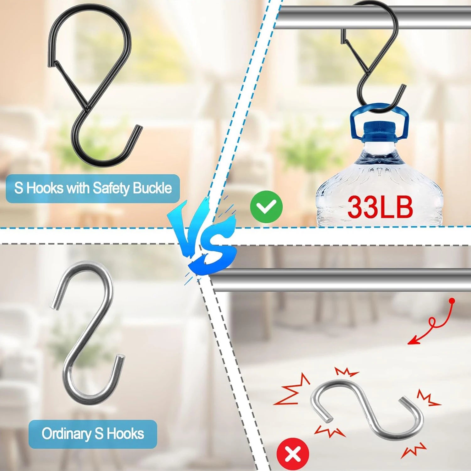 Large Size & Safety Buckle: The safety locking side of its hook is large in diameter, the s hooks large side opening is 1.5-1.8 inch; small side opening is 1.2 inch.Two size opening could meet different needs.Very solid and could bear heavy items.S hooks for hanging design comes with a unique metal locking clasp, which prevents the suspension from falling even in high winds for added safety compared to regular S hooks.