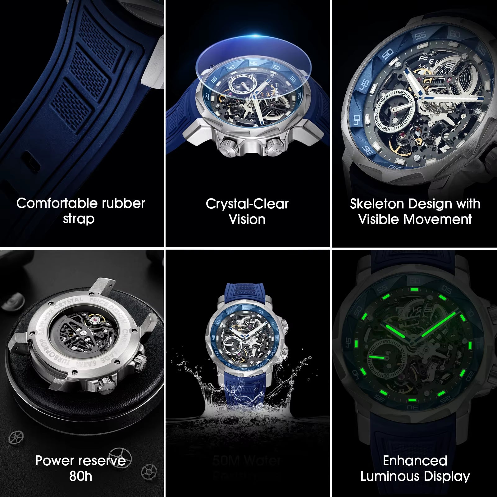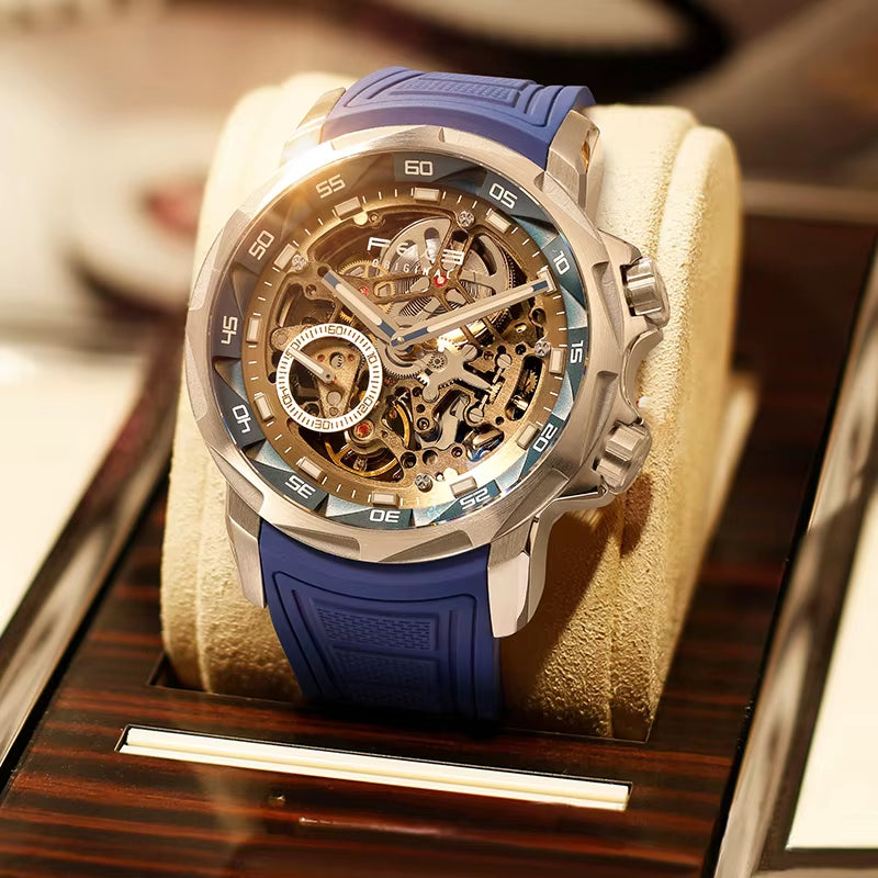 ⌚Carved three-dimensional skeleton dial, complex gears, showing the beauty of the three-dimensional structure, the watch records not only the time, but also the fusion of art and technology. 80 hours of endurance, vibration frequency of 28,800 / h, 1/2 hair processing accuracy, dynamic seconds disc, equipped with a double engine crown design, the new trapezoidal design of the crown protection device cool feeling.