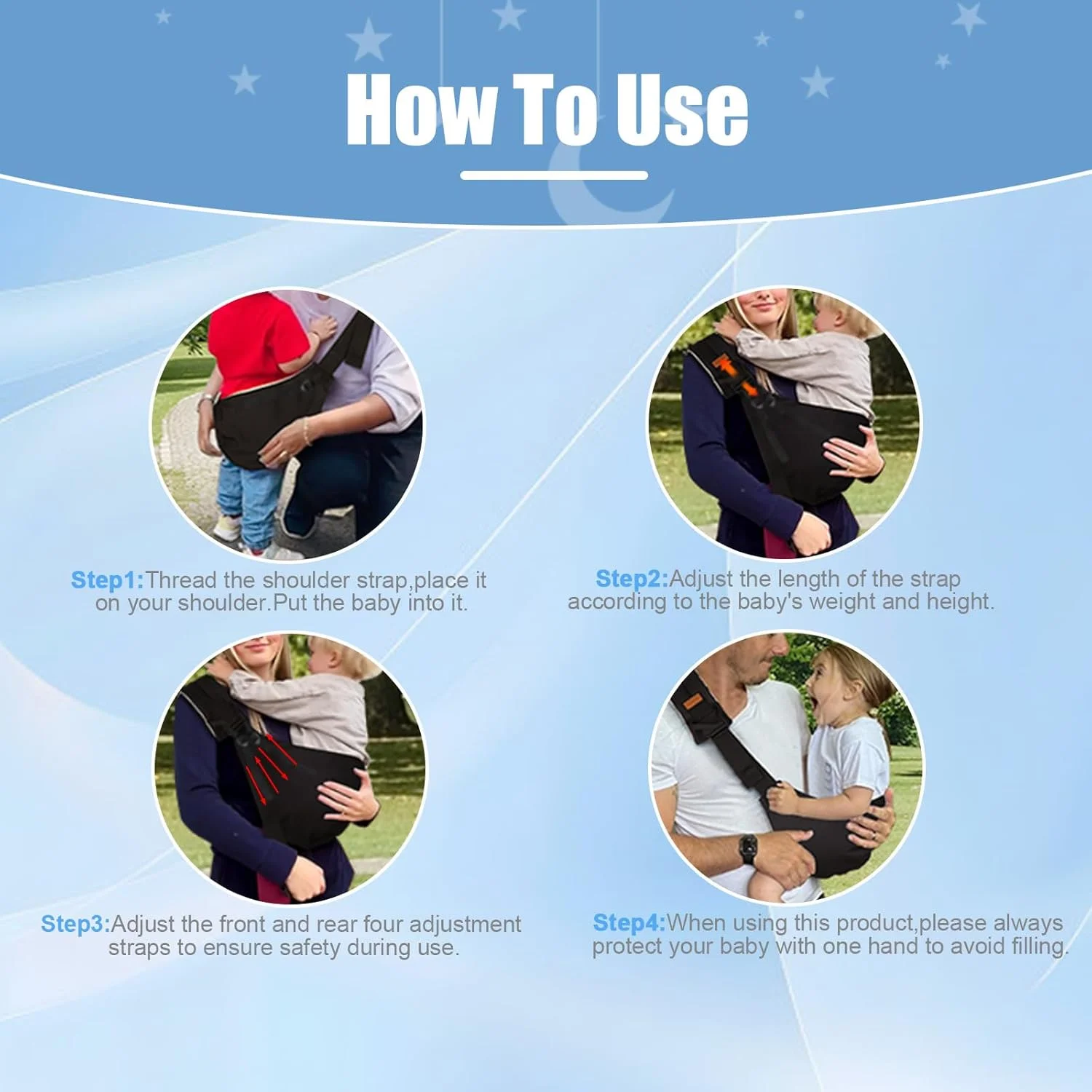 [Easy to Use]:Thread the shoulder strap through your body and place It on your shoulder and then carrying the baby, everyone has different heights and weights.You need to adjust it a few more times to make it more suitable for your baby.Please hold the baby's back with one hand for safety.
