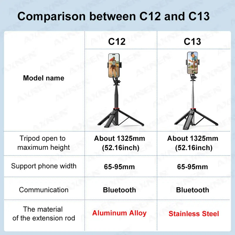 Both C12 and C13 are multifunctional selfie tripods with multiple shooting angles, enriching your shooting experience.
